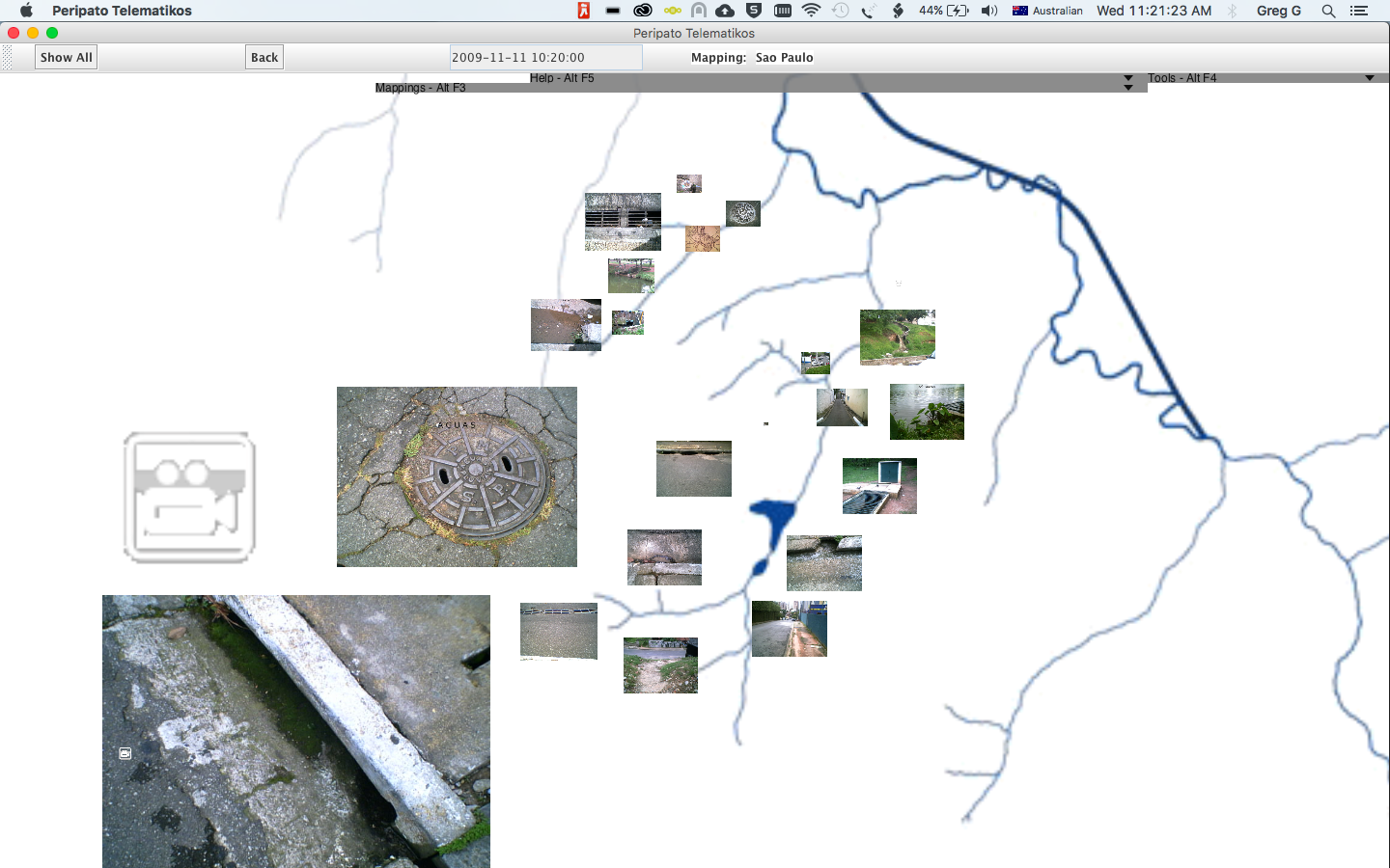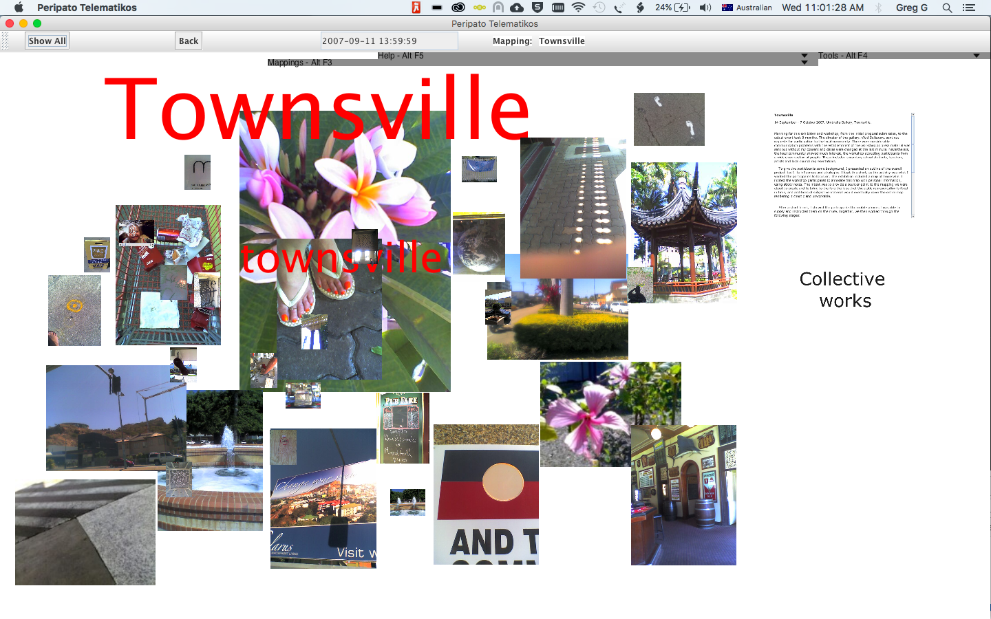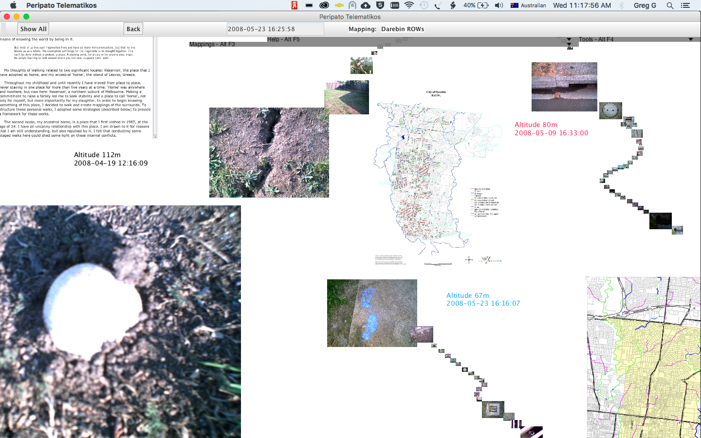Peripato Telematikos - walking as performance, subjective cartography and custom-written software/hardware system. The images, text, audio and video that constitute these mappings have been contributed using a mobile phone. Images, sound and video are sent using MMS and text using SMS whilst exploring spaces on foot.