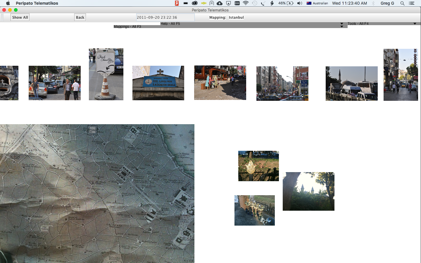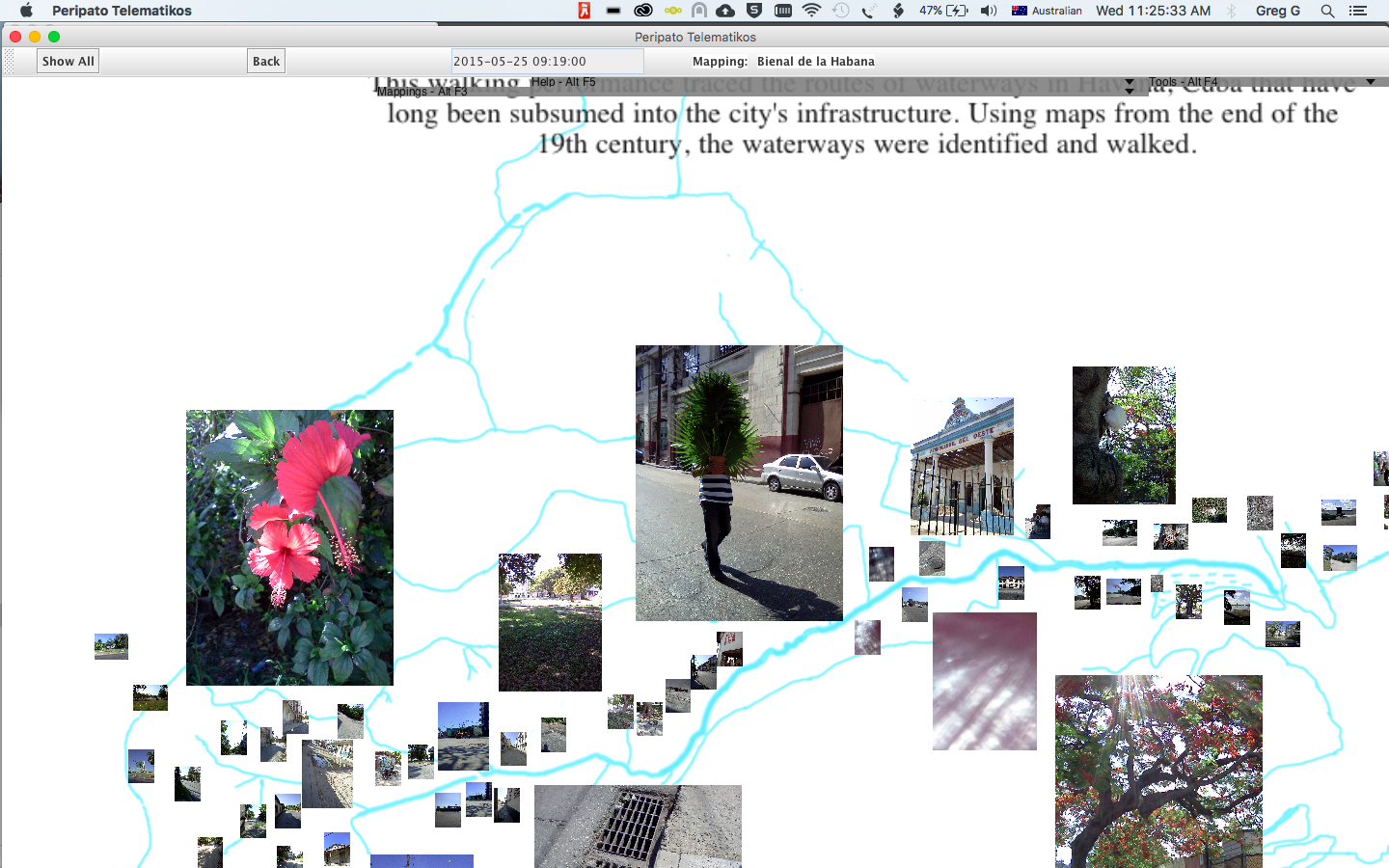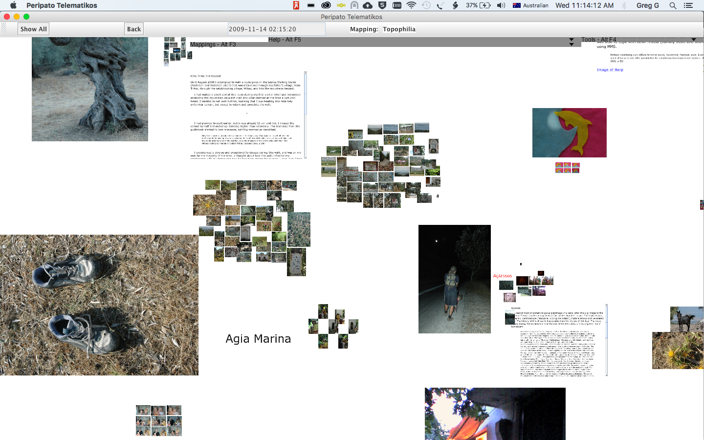Peripato Telematikos - walking as performance, subjective cartography and custom-written software/hardware system. The images, text, audio and video that constitute these mappings have been contributed using a mobile phone. Images, sound and video are sent using MMS and text using SMS whilst exploring spaces on foot.