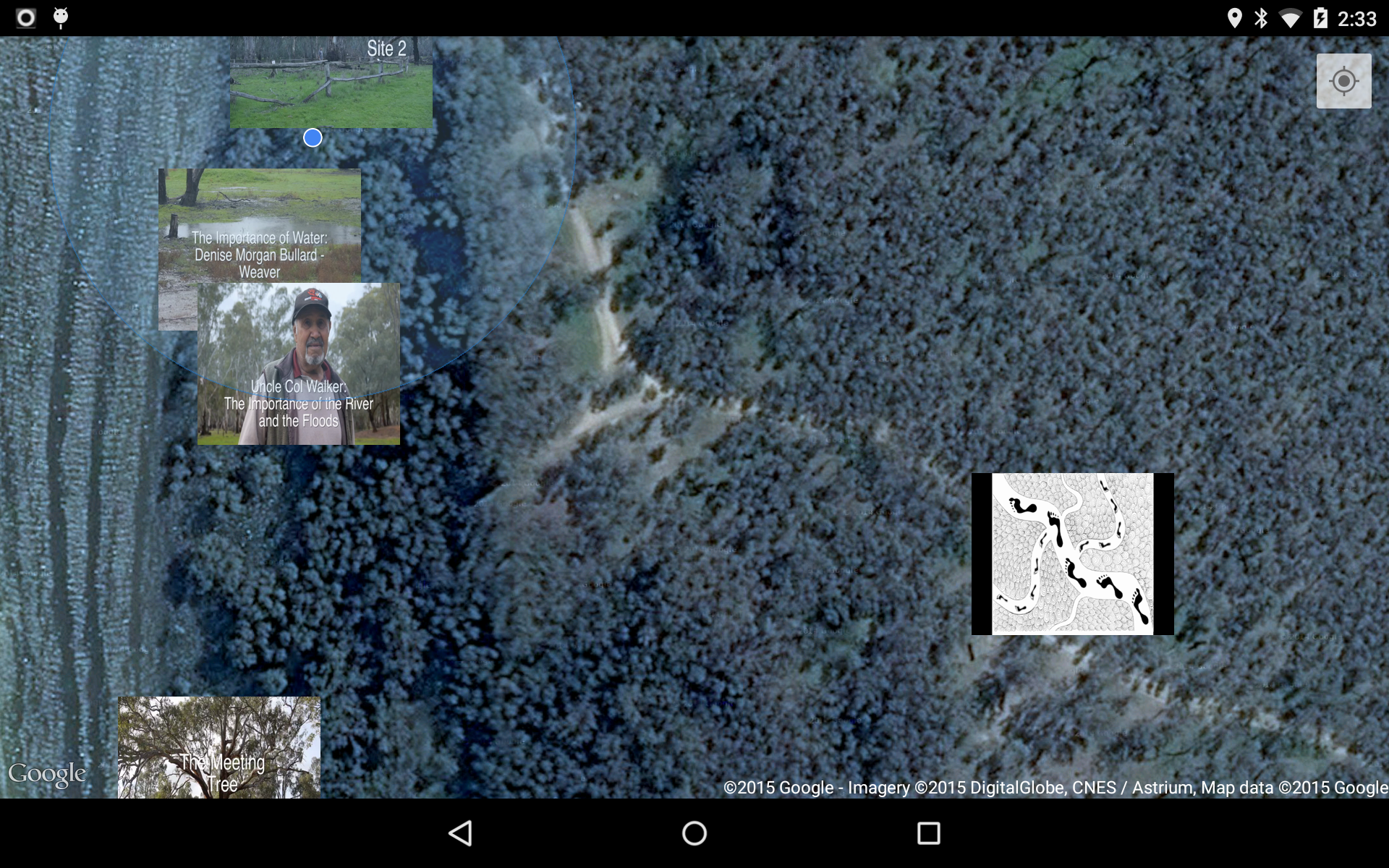App for Android utilising google maps, local artwork and video recordings of elders discussing aspects of the Barmah Forest that are triggered by GPS and Bluetooth walking through the forest. App Screenshot